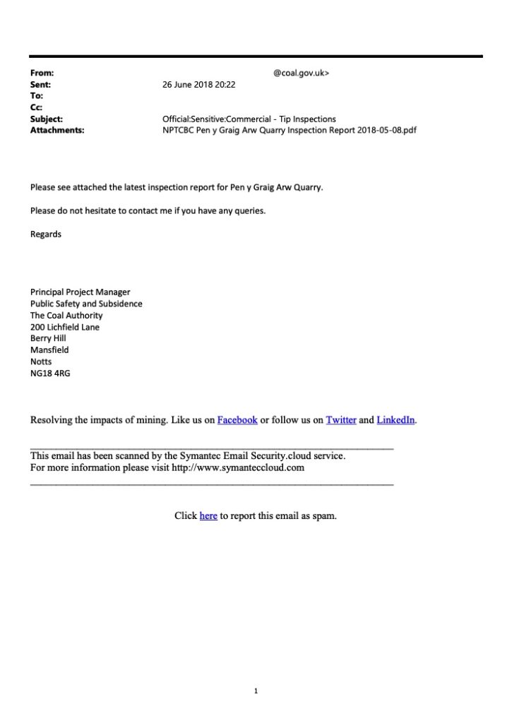 CA email to NPTCBC 'Please see attached the latest report for Pen y Graig Arw Quarry'