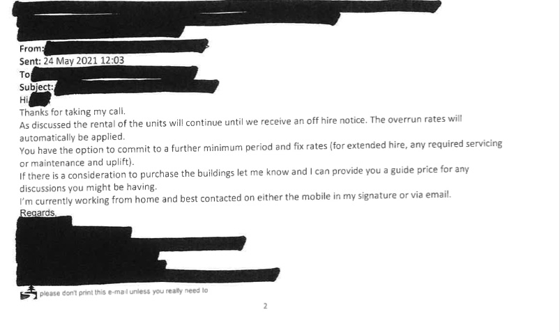 Cabin supplier email to NPTCBC - RE: Telephone call, Ongoing rates