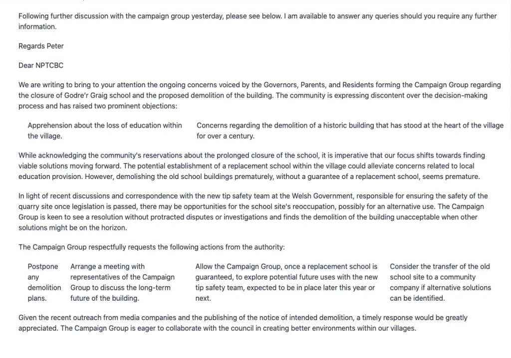 We are writing to bring to your attention the ongoing concerns voiced by the Governors, Parents, and Residents forming the Campaign Group regarding the closure of Godre’r Graig school and the proposed demolition of the building. The community is expressing discontent over the decision-making process and has raised two prominent objections: