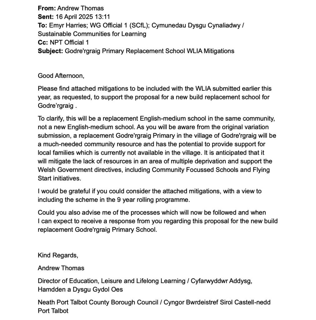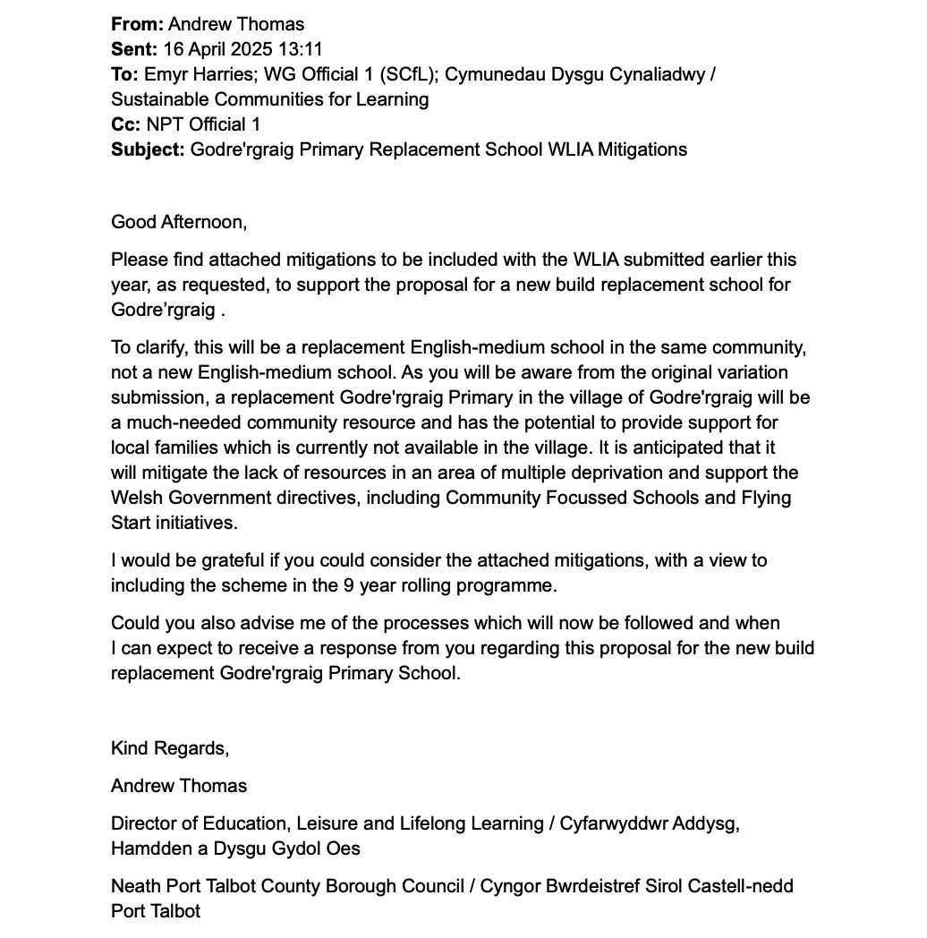 Please find attached mitigations to be included with the WLIA submitted earlier this year, as requested, to support the proposal for a new build replacement school for Godre’rgraig .
