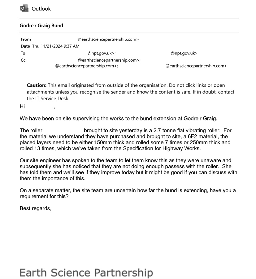 ESP email NPTCBC ' the team are unsure how far the bund is extending'
