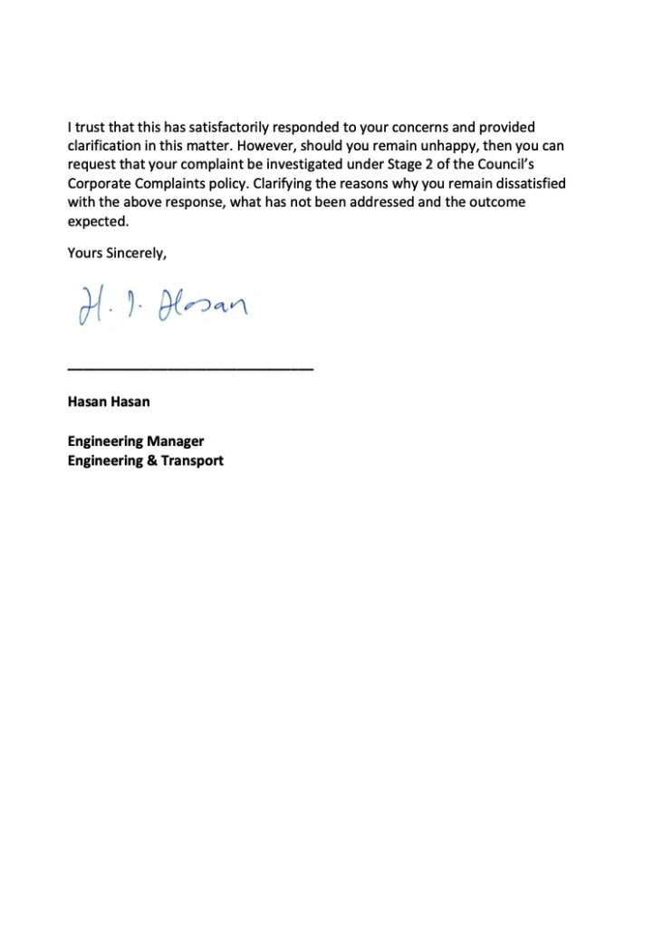 I trust that this has satisfactorily responded to your concerns and provided clarification in this matter. However, should you remain unhappy, then you can request that your complaint be investigated under Stage 2 of the Council’s Corporate Complaints policy. Clarifying the reasons why you remain dissatisfied with the above response, what has not been addressed and the outcome expected.