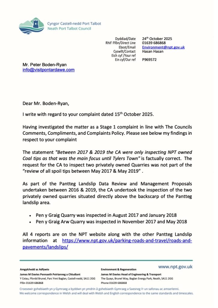 The statement “Between 2017 & 2019 the CA were only inspecting NPT owned Coal tips as that was the main focus until Tylers Town” is factually correct. The request for the CA to inspect two privately owned Quarries was not part of the “review of all spoil tips between May 2017 & May 2019” .