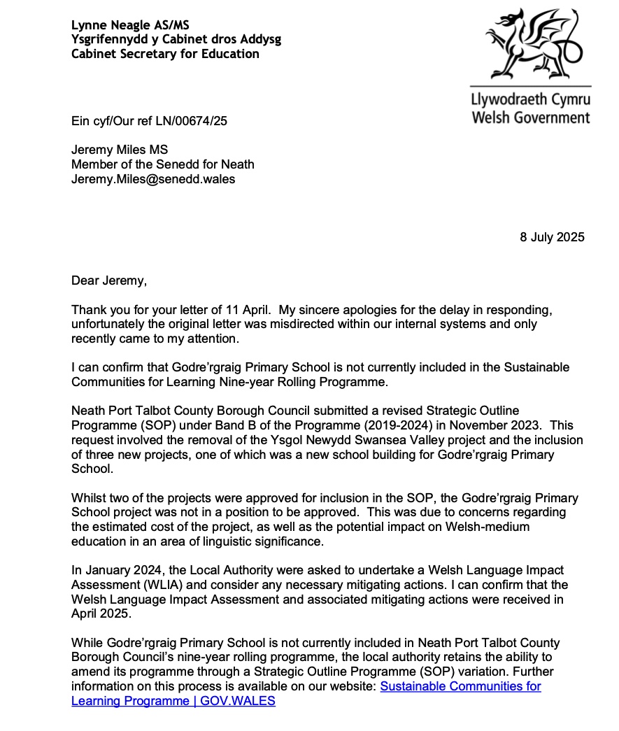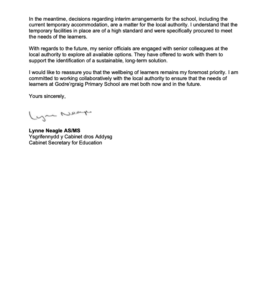 I would like to reassure you that the wellbeing of learners remains my foremost priority. I am committed to working collaboratively with the local authority to ensure that the needs of learners at Godre’rgraig Primary School are met both now and in the future.