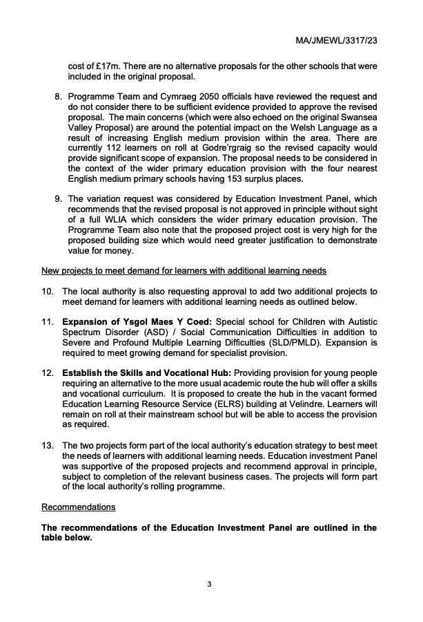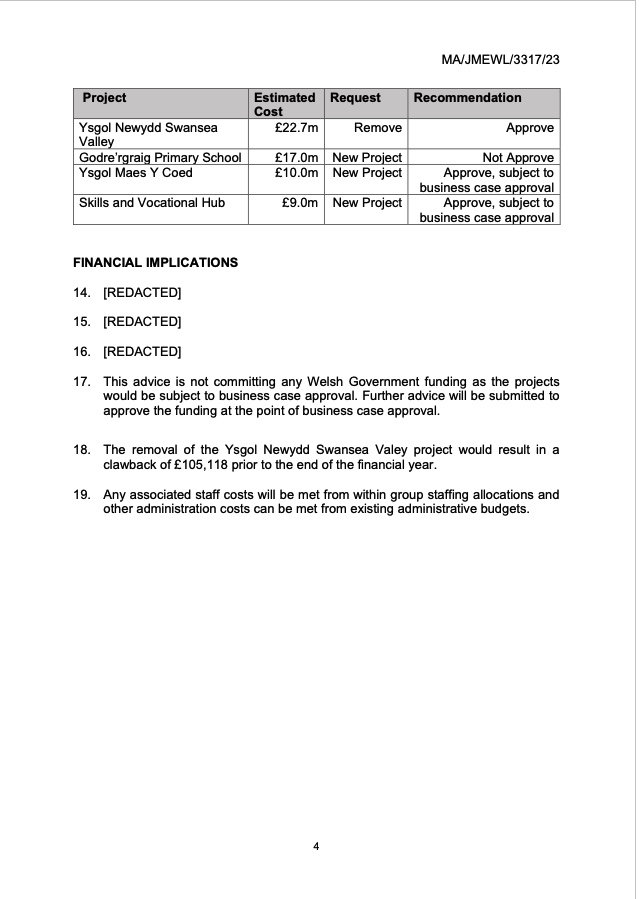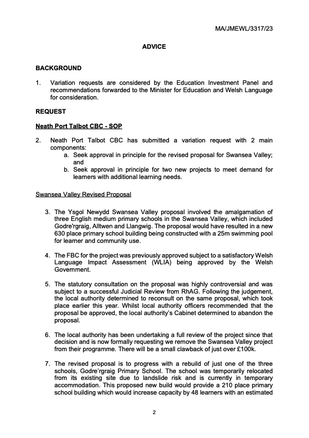 MINISTERIAL ADVICE - For decision by: Minister for Education and Welsh Language - Not to approve a new build school, Godre'r Graig