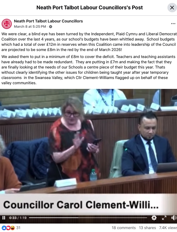 We asked them to put in a minimum of £8m to cover the deficit. Teachers and teaching assistants have already had to be made redundant. They are putting in £7m and making the fact that they are finally looking at the needs of our Schools a centre piece of their budget this year. Thats without clearly identifying the other issues for children being taught year after year temporary classrooms in the Swansea Valley, which Cllr Clement-Williams flagged up on behalf of these valley communities.