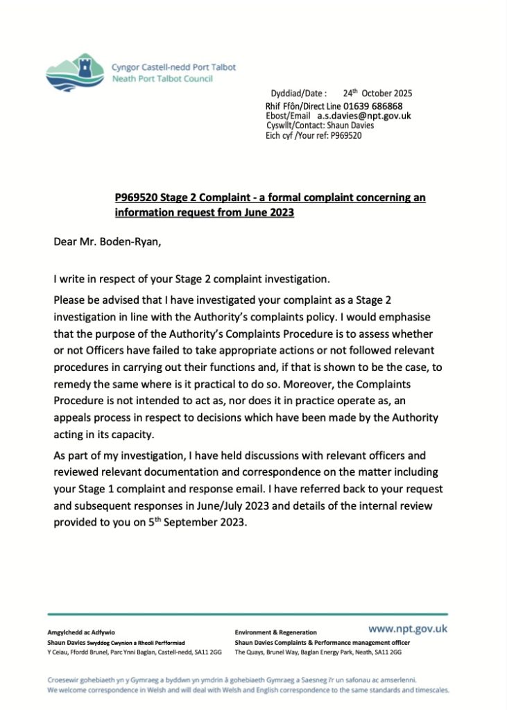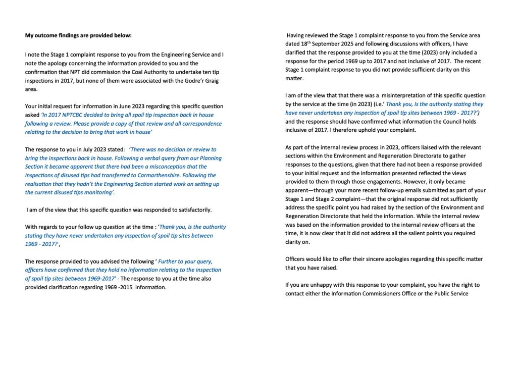 I note the Stage 1 complaint response to you from the Engineering Service and I note the apology concerning the information provided to you and the confirmation that NPT did commission the Coal Authority to undertake ten tip inspections in 2017, but none of them were associated with the Godre’r Graig area.