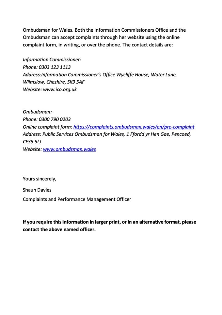 Online complaint form: https://complaints.ombudsman.wales/en/pre-complaint Address: Public Services Ombudsman for Wales, 1 Ffordd yr Hen Gae, Pencoed, CF35 5LJ