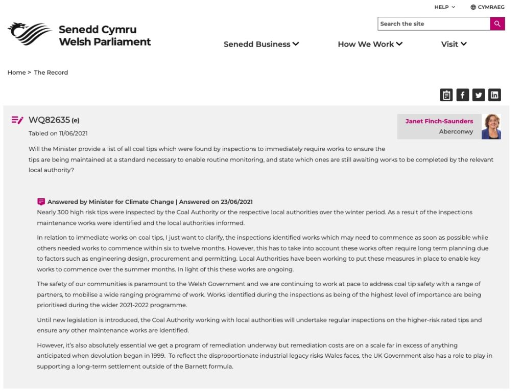 In relation to immediate works on coal tips, I just want to clarify, the inspections identified works which may need to commence as soon as possible while others needed works to commence within six to twelve months. However, this has to take into account these works often require long term planning due to factors such as engineering design, procurement and permitting. Local Authorities have been working to put these measures in place to enable key works to commence over the summer months. In light of this these works are ongoing.