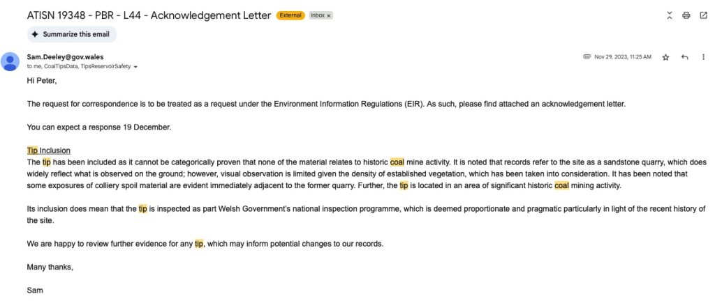 - About- The request for correspondence is to be treated as a request under the Environment Information Regulations (EIR). As such, please find attached an acknowledgement letter. - You can expect a response 19 December. - Tip Inclusion - The tip has been included as it cannot be categorically proven that none of the material relates to historic coal mine activity. It is noted that records refer to the site as a sandstone quarry, which does widely reflect what is observed on the ground; however, visual observation is limited given the density of established vegetation, which has been taken into consideration. It has been noted that some exposures of colliery spoil material are evident immediately adjacent to the former quarry. Further, the tip is located in an area of significant historic coal mining activity. - Its inclusion does mean that the tip is inspected as part Welsh Government’s national inspection programme, which is deemed proportionate and pragmatic particularly in light of the recent history of the site. - We are happy to review further evidence for any tip, which may inform potential changes to our records. - Many thanks,