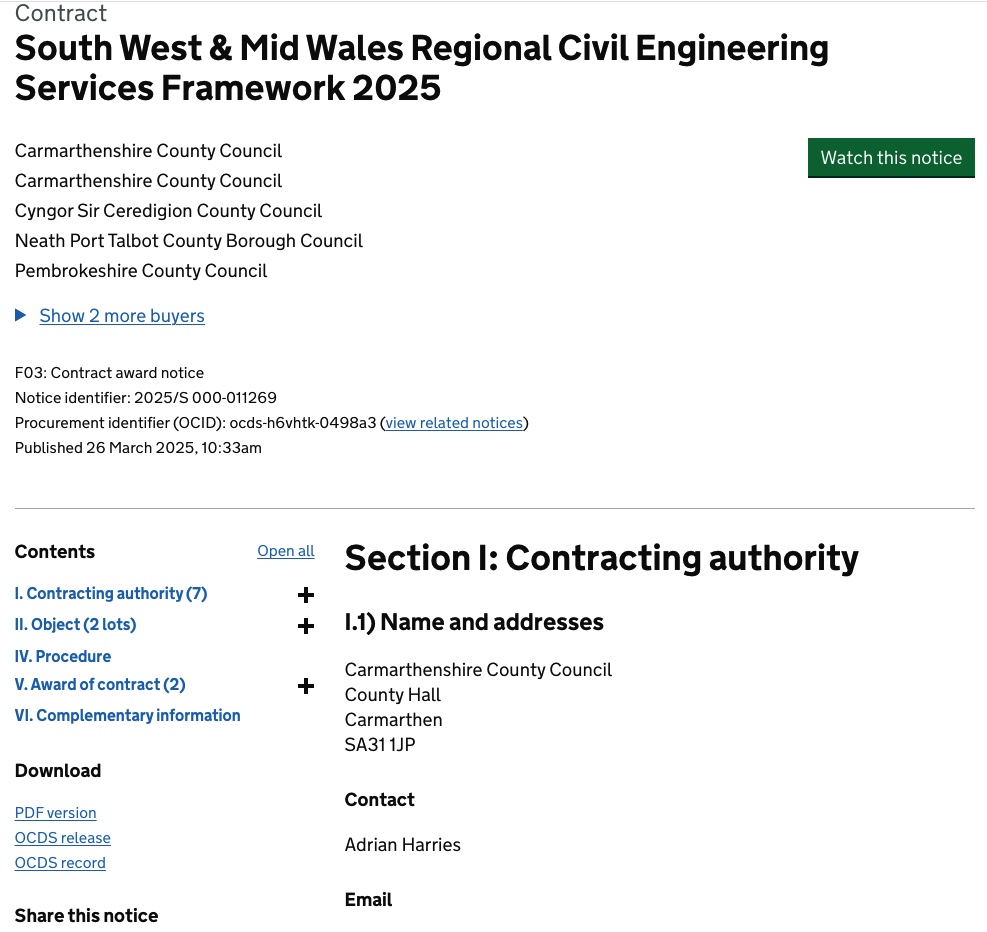 - About- PLEASE NOTE: THIS IS A CONTRACT AWARD NOTICE, NOT A TENDER OPPORTUNITY - Carmarthenshire County Council in association with Ceredigion County Council, Neath Port Talbot County Borough Council, Pembrokeshire County Council, Powys County Council and Swansea Council (‘the Councils’) has appointed suitably qualified Consultant Engineers who will provide a full range of civil engineering design related services across the Region. - The Framework consists of two lots, one for Specialist Consultancy Services and one for Multi-Disciplinary Services. - Please note that the figure for the total value of the contract/lot (v.2.4) under Section V ‘Award of Contract’ in each lot, is the anticipated total value of the Framework as a whole, over 4 years. As this is a framework arrangement, total values of spend for each individual lot cannot be specified.