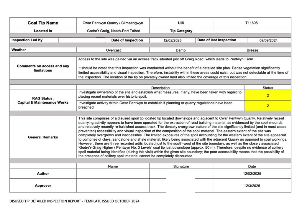 Tip inspection Cwar Pentwyn Quarry / Cilmaengwyn L44B / T11695