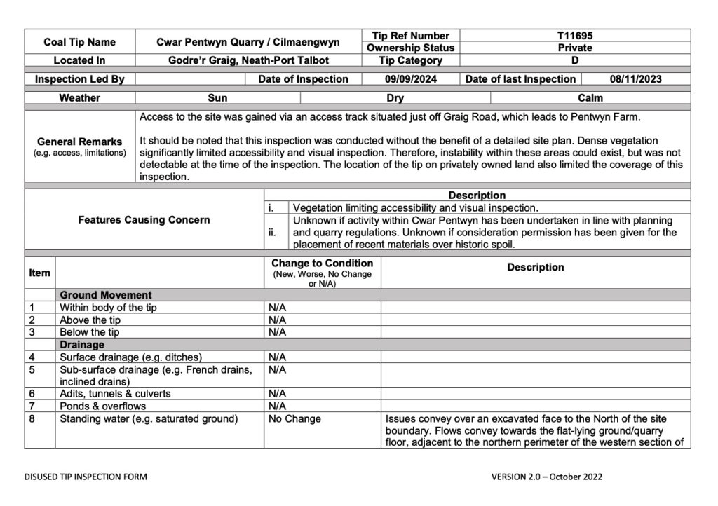 Tip inspection Cwar Pentwyn Quarry / Cilmaengwyn L44B / T11695