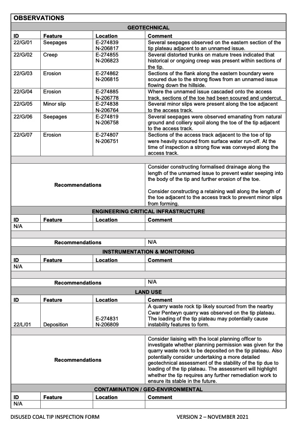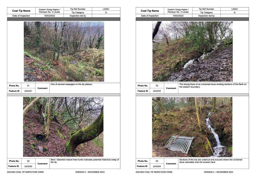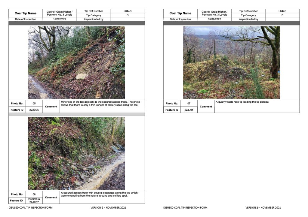 The small tip consists of a steep sided elongated lobe of end tipped colliery orientated northeast – southwest on the steep lower slopes of Mynydd Allt-y-grug. According to BGS sheet 230 the underlying bedrock geology comprises of the Llynfi mudstone, siltstone and sandstone member from the Upper Coal Measures and the superficial geology is recorded as diamicton till. There are several recorded adits across the hillside that are likely related to the Tareni Colliery works that was operational from 1903 to 1952. Later minor works in the area occurred during the late 1990s and early 2000s. The tip is generally densely vegetated with brambles, bracken and mature trees. A section of the tip plateau has been loaded with a quarry waste rock tip which was sourced from the nearby Cwar Pentwyn quarry. An unnamed issue flows through sections of the tip along the eastern boundary down to the access track at the toe of the tip. Flows are then conveyed along a scoured access track into highway drainage at the beginning of the access track. There are several minor slips and seepages present on the toe along the access track. Several residential properties are located downslope of the tip