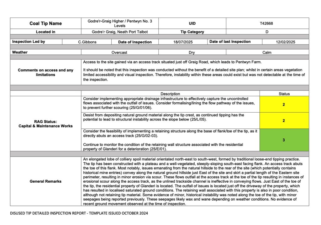 Tip inspection Godre'r-Graig Higher / Pentwyn No. 3 Levels L44C / T42668