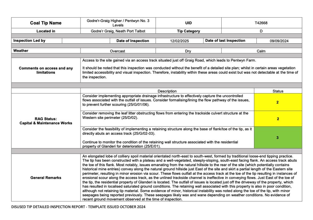 Tip inspection Godre'r-Graig Higher / Pentwyn No. 3 Levels L44C / T42668