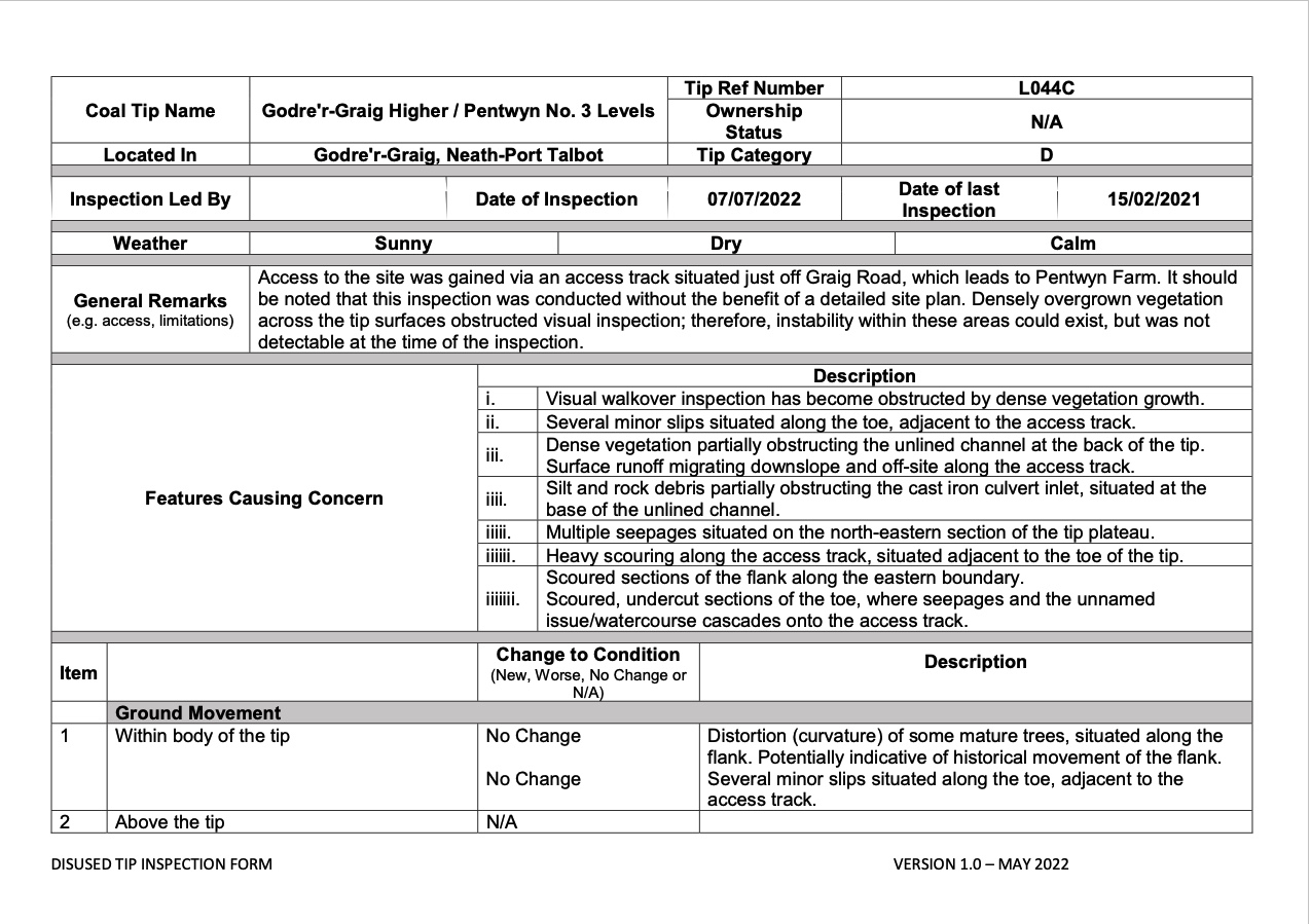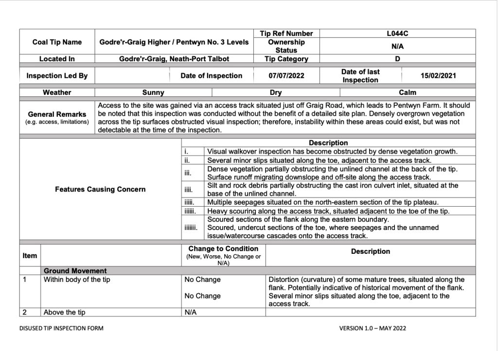 Tip Inspection - Godre'r-Graig Higher / Pentwyn No. 3 Levels L44C