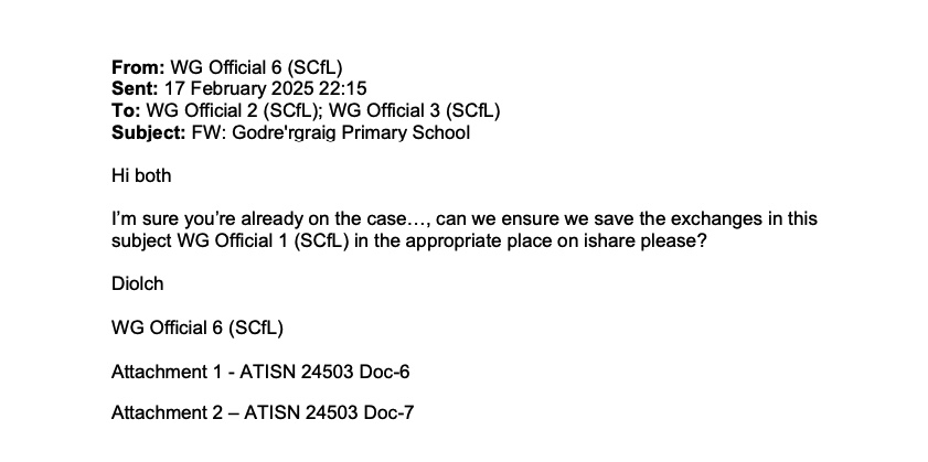 WG internal email 'I’m sure you’re already on the case..., can we ensure we save the exchanges in this subject WG Official 1 (SCfL) in the appropriate place on ishare please?'