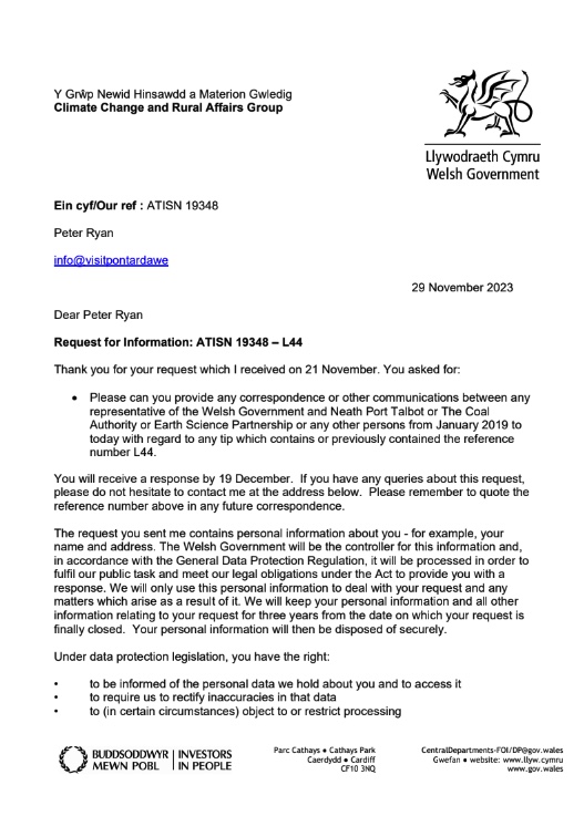 Please can you provide any correspondence or other communications between a any representative of the Welsh Government and Neath Port Talbot or The Coal Authority or Earth Science Partnership or other any other persons from January 2019 to today with regard to any tip which contains or previously contained the reference number L44.